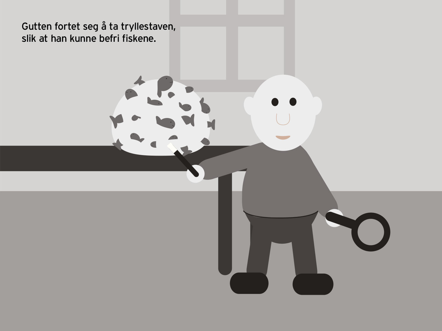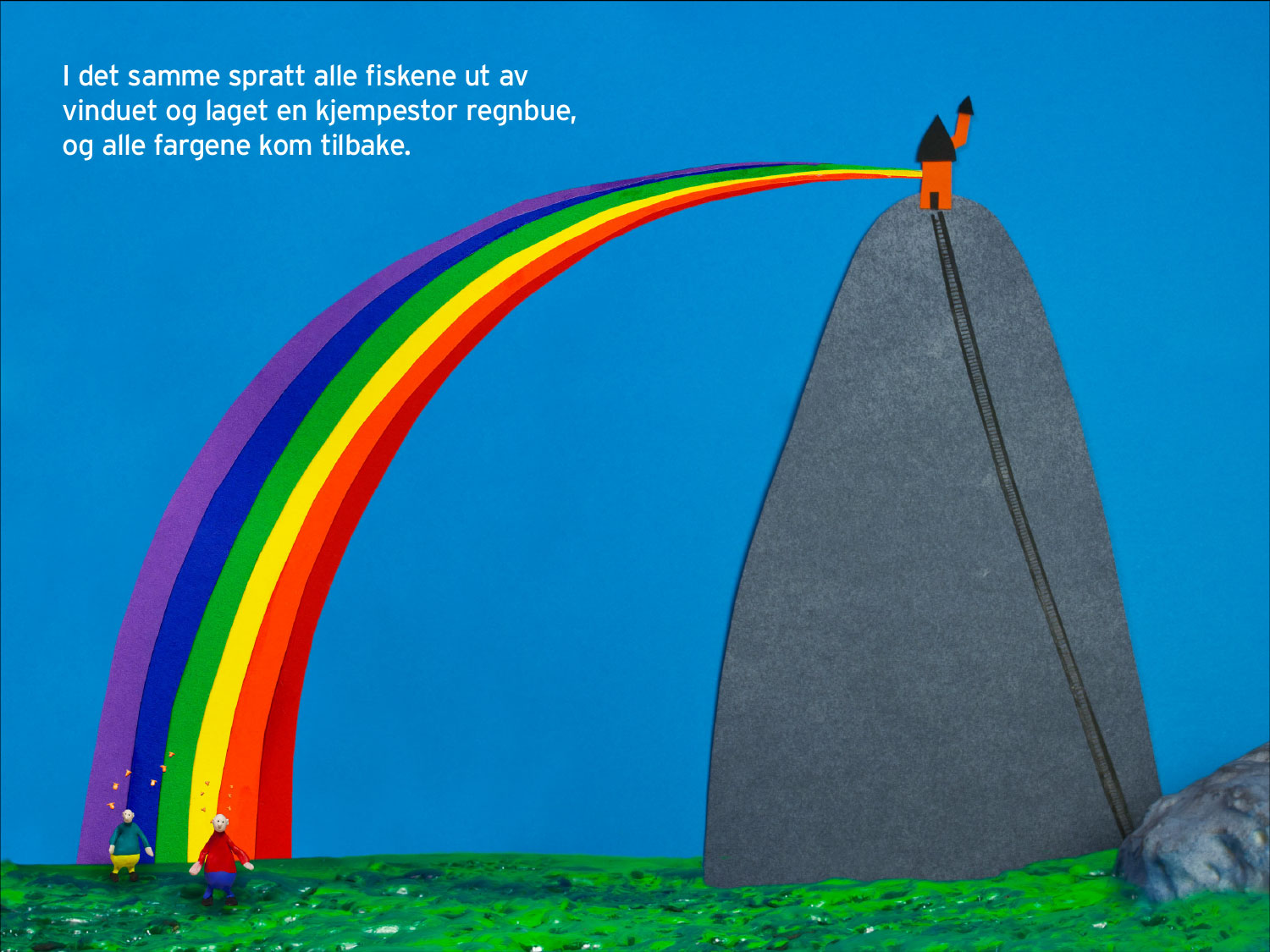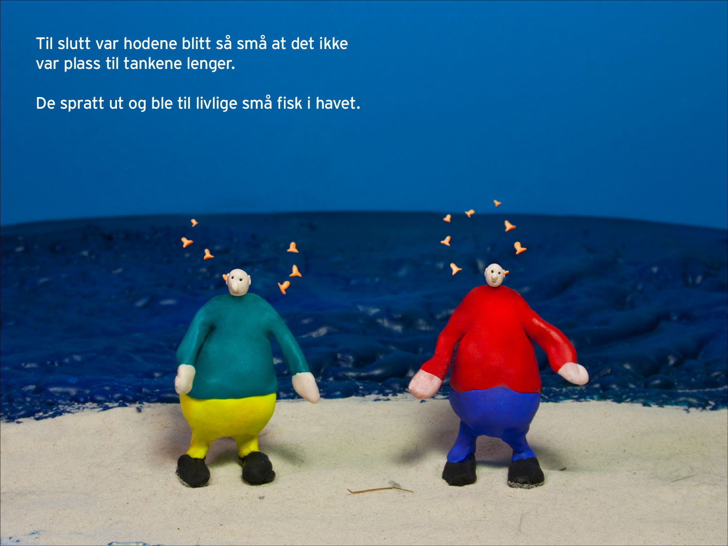 Samtidig var det viktig å bevare gjenkjennelige karakterer gjennom hele boken. Kontinuitet i form, farger og uttrykk gjør at leseren kan følge figurene emosjonelt, selv når både omgivelser og visuelle virkemidler endrer seg.